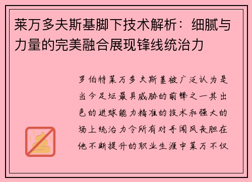 罗伯特·莱万多夫斯基被广泛认为是当今足坛最具威胁的前锋之一,其出色的进球能力、精准的技术和强大的场上统治力,令所有对手闻风丧胆。在他不断提升的职业生涯中,莱万不仅以个人进球数为代表,更以其独特的脚下技术——细腻与力量的完美融合而备受赞誉。本文将从四个方面详细解析莱万的脚下技术,展示他如何通过控制球感、精确的射门技巧、强大的身体对抗能力以及卓越的跑位与时机掌控,展现出他在锋线的统治力。通过对这些技术的深入分析,我们可以更好地理解为何莱万能够在顶级赛事中持续表现出色,成为当今足坛最具影响力的前锋之一。